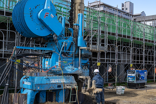 元来、パイル打ち(シートパイル(鋼矢板)打込やコンクリートパイル打込)等を含む杭打ち工事には振動や打撃による打設工法が一般的でしたが、騒音や振動問題に苦悩していた建設業界の救世主として登場したのが『圧入工法』です。