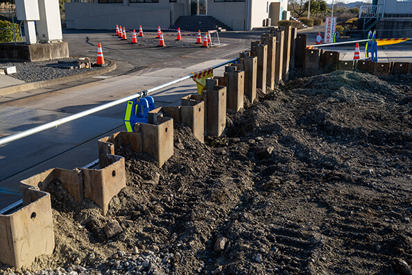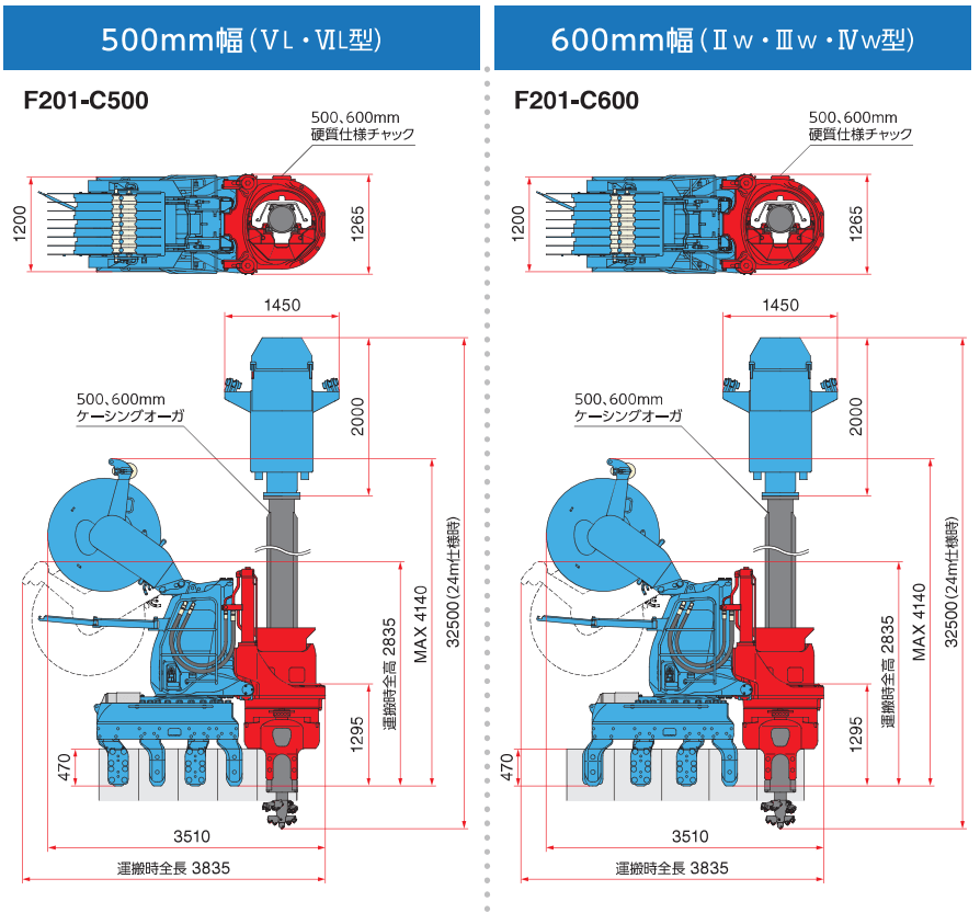 現在、U型鋼矢板(400mm幅)、広幅鋼矢板(500,600mm幅)、ハット型鋼矢板(900mm幅)があり、いずれも硬質地盤クリア工法の施工機械があります。