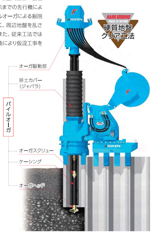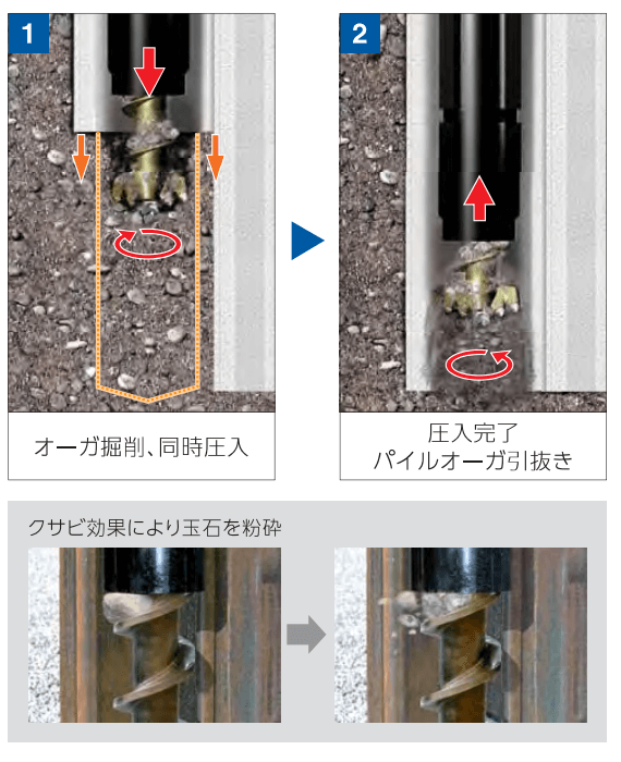 圧入とオーガ掘削を連動させた『芯抜き理論』により、圧入の優位性を損なうことなく、硬質地盤への圧入を実現しました。