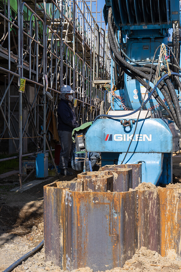 まず、パイルオーガにて最小限の掘削を行い、地中に芯をくり抜いた状態をつくり出します。そして、パイルオーガを引き抜きながらその隙間に杭を圧入していきます。掘削はあくまで圧入補助として最小限に抑えるので排土量は少なく、周辺地盤を乱さない為、強い支持力を持った完成杭を構築できます。