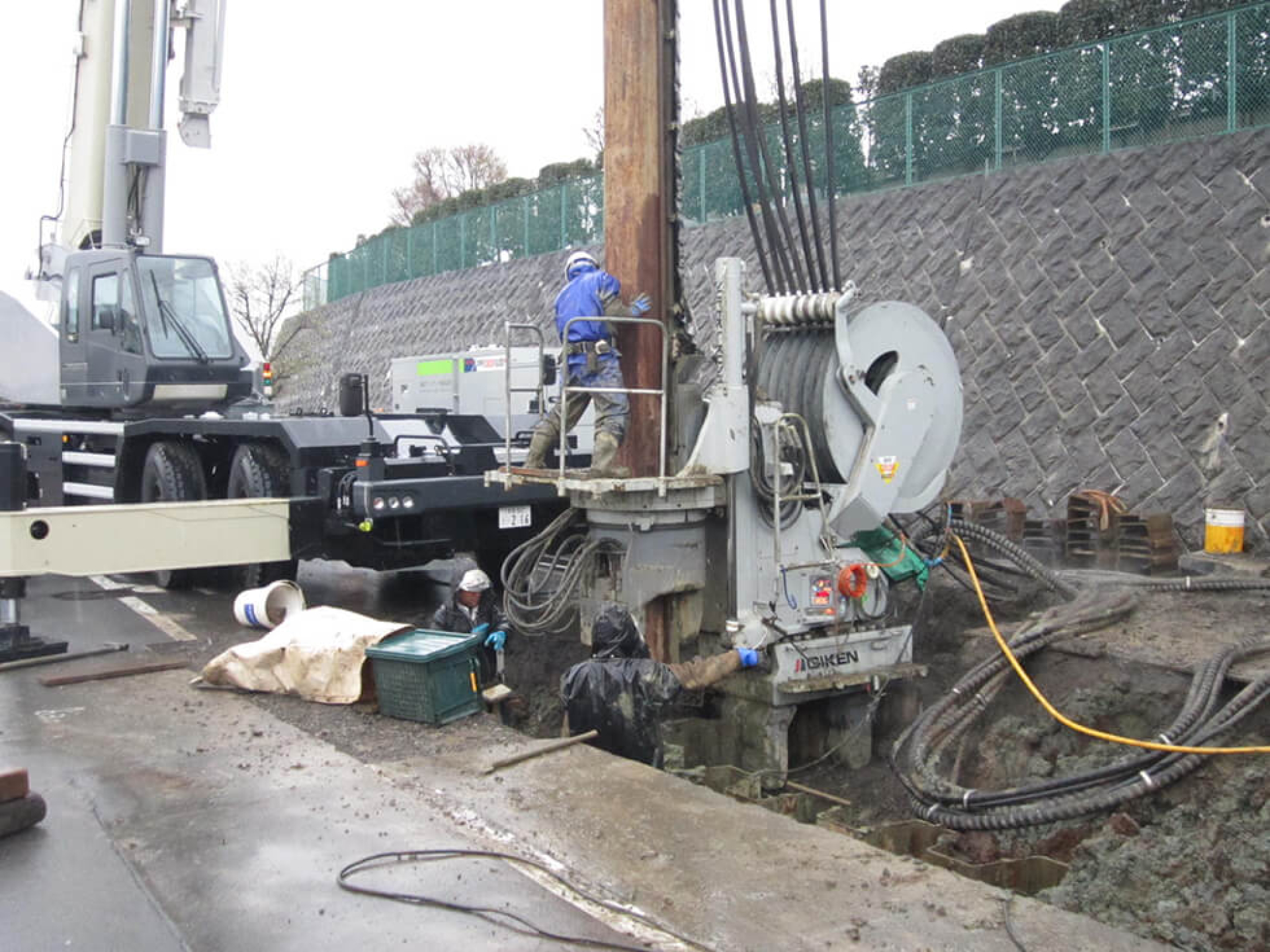 玉石を含む地盤や砂礫、岩盤層などの硬質地盤でも圧入工法の優位性を損なわず杭施工ができます。