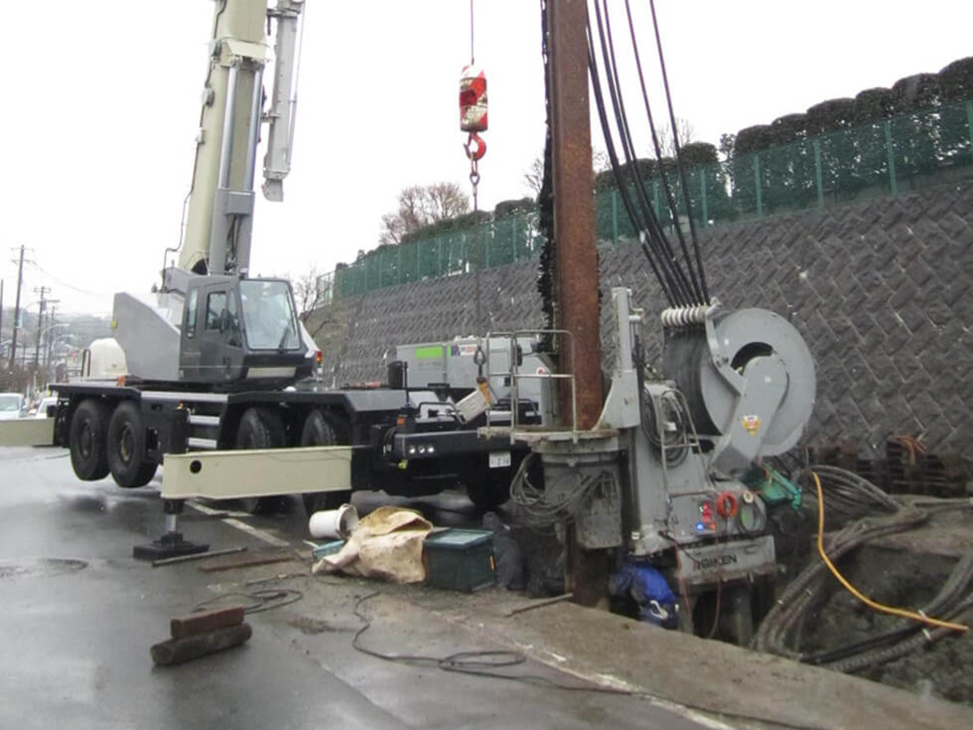 W.J.併用バイブロ圧入から設計変更となり、ライナーでの施工との検討の結果、安全性を考慮してクラッシュパイラーによる鋼矢板打設となった現場です。近隣の交通事情を考慮して時間帯通行止めにて施工を行い、時間・スペースの制限がりましたが新開工業様、江戸鉄株式会社様のご協力の元、施工完了しました。