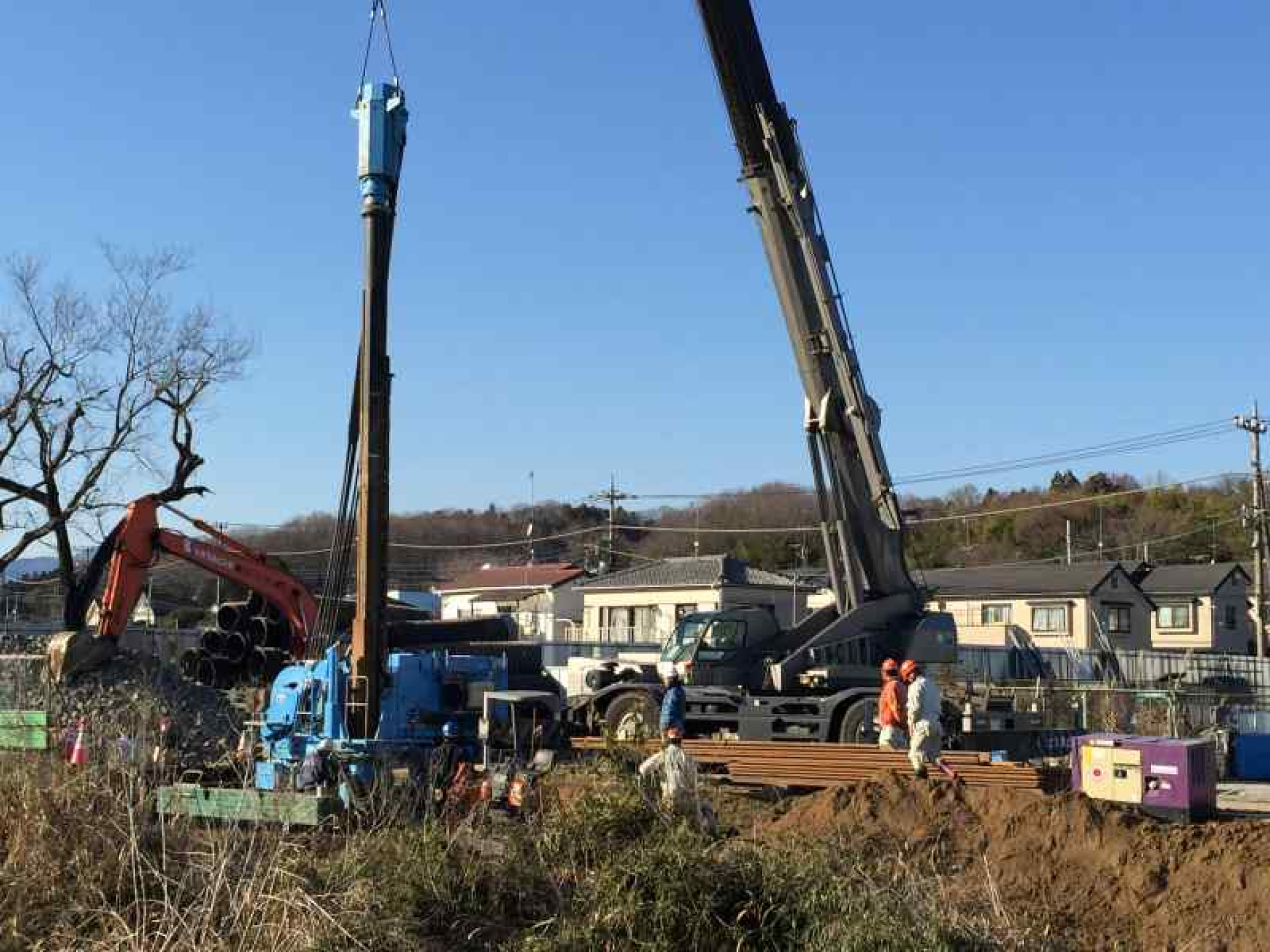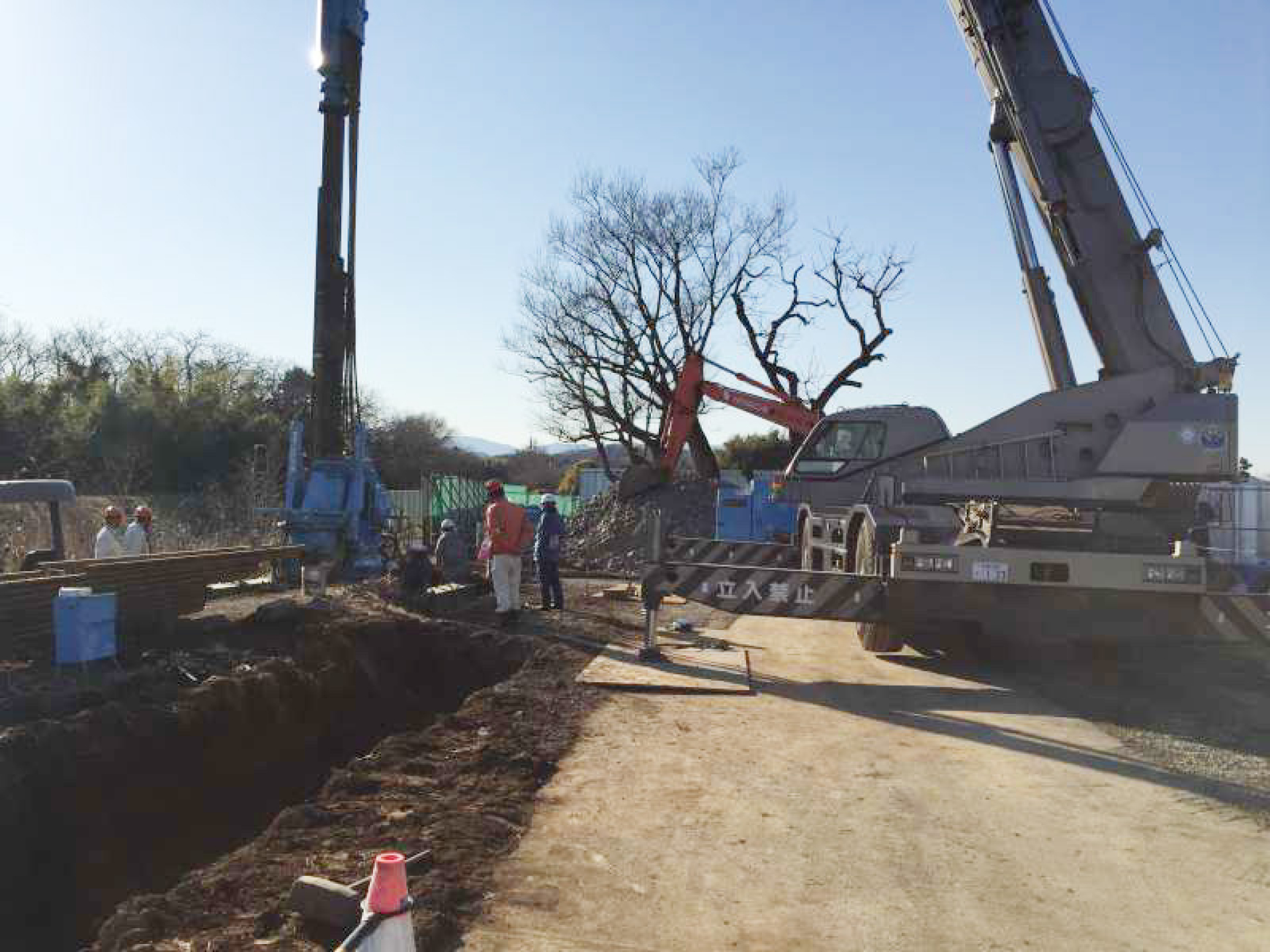 川沿いにシートパイルを圧入する工事でしたが作業エリアが狭く、なおかつ並行する杭芯の1つが作業エリア中央を横断するためクレーンなどの機材置場に留意しながら施工しました。