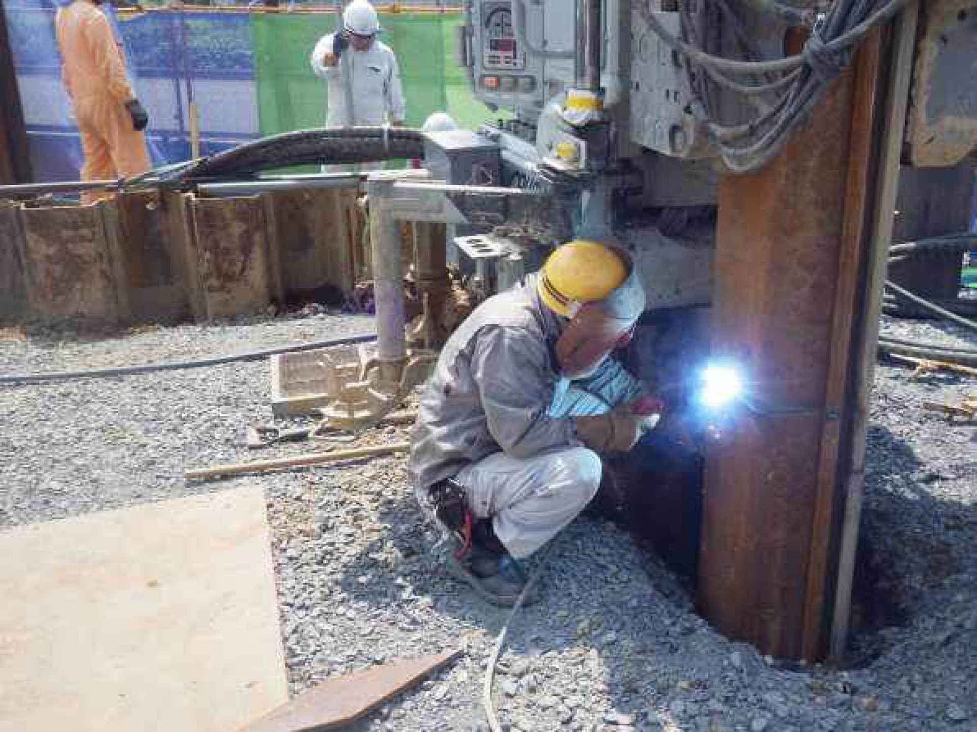 杭長27.5mのため、縦継溶接により施工しました。下杭の鋼矢板を圧入後、上杭の鋼矢板を立てたまま溶接しますがクラッシュパイラーの構造上、背側のみの溶接となるため熱ひずみの考慮が必要なため高い溶接技術も要求されます。