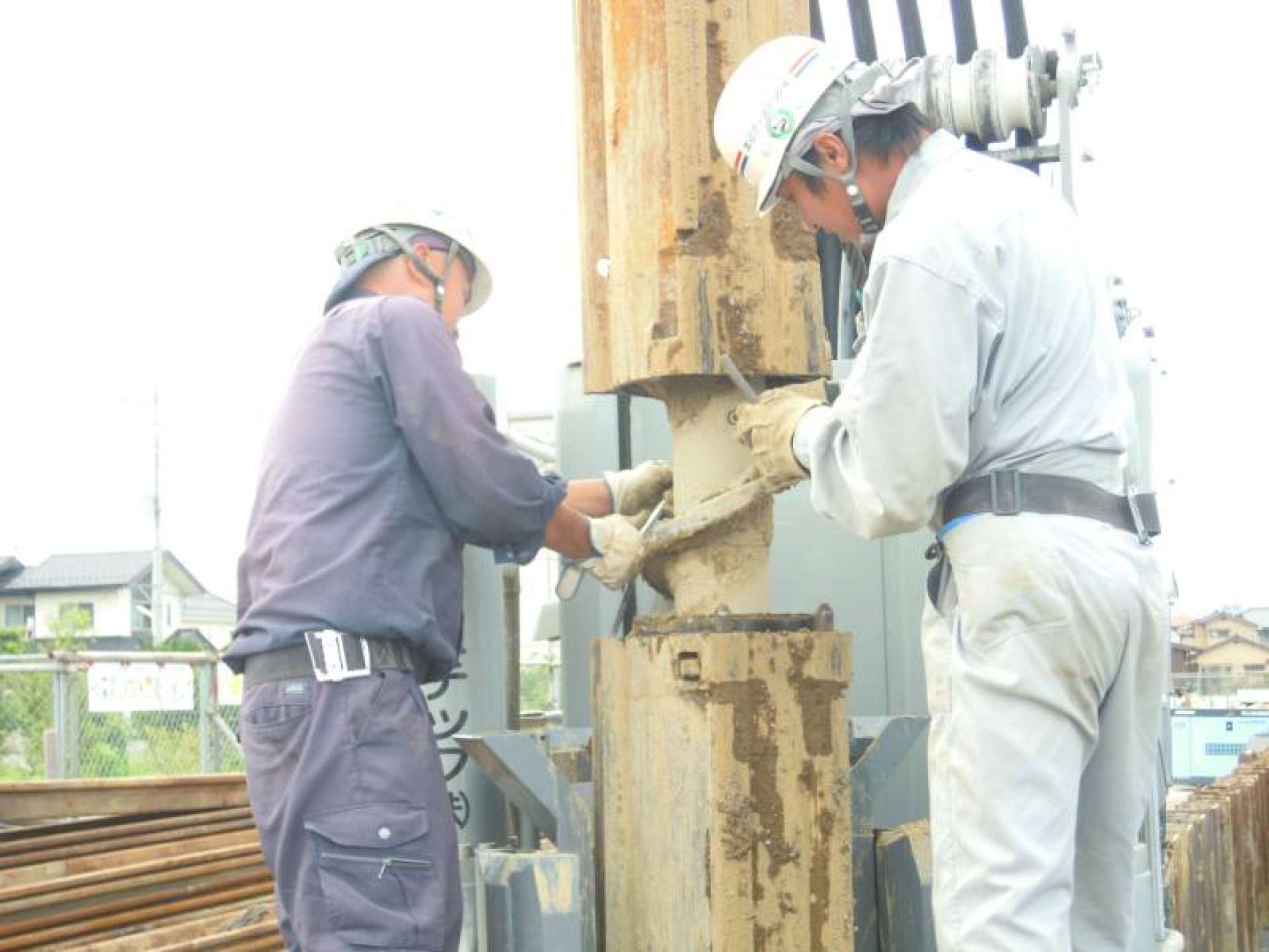 上空架線が撤去できないため架線部下を1ヶ所縦継施工をしました。下杭を打設し、縦継溶接を行い、中間部セットを接合後上杭を打設し上空架線を避けて施工完了しました。